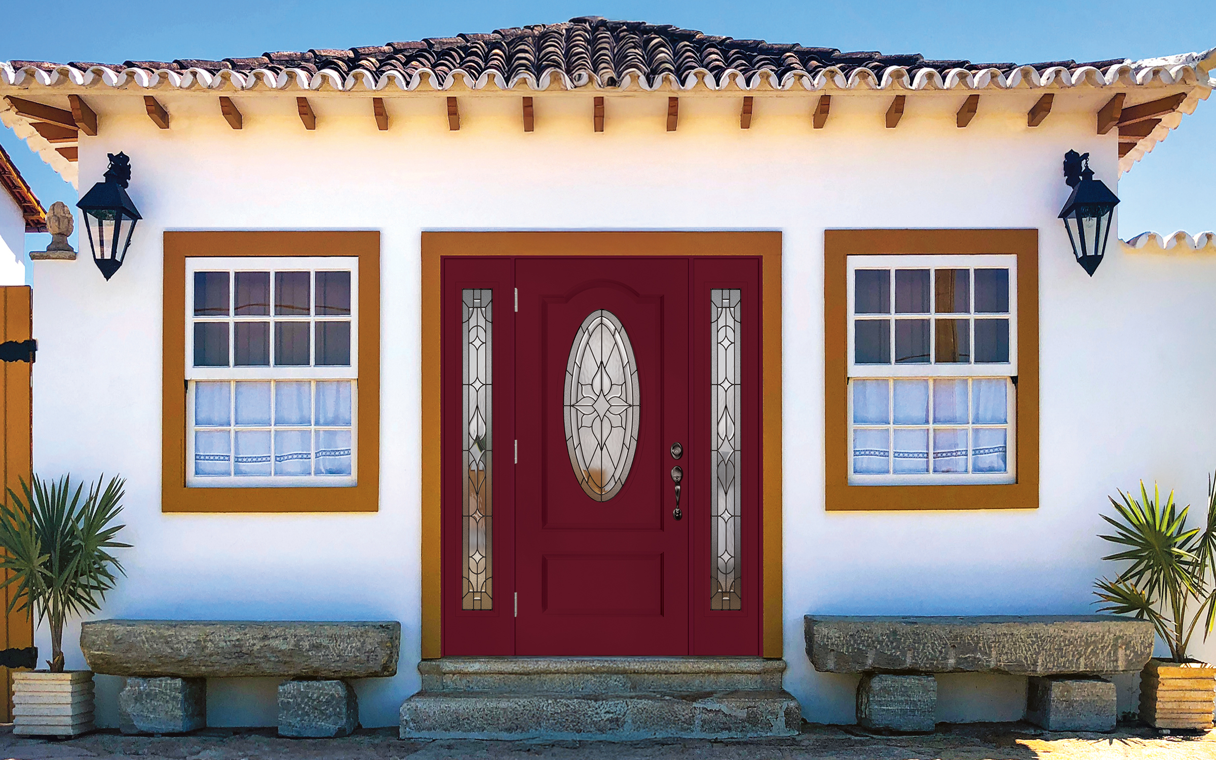 Experience what our award winning fiberglass exterior entry doors have to offer. Durability and energy efficiency of fiberglass. Hand stained finish with hand crafted decorative glasses for a major curb appeal.